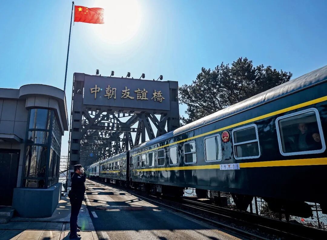 3月12日,辽宁丹东至朝鲜平壤的95次列车通过中朝友谊桥。图/新华
