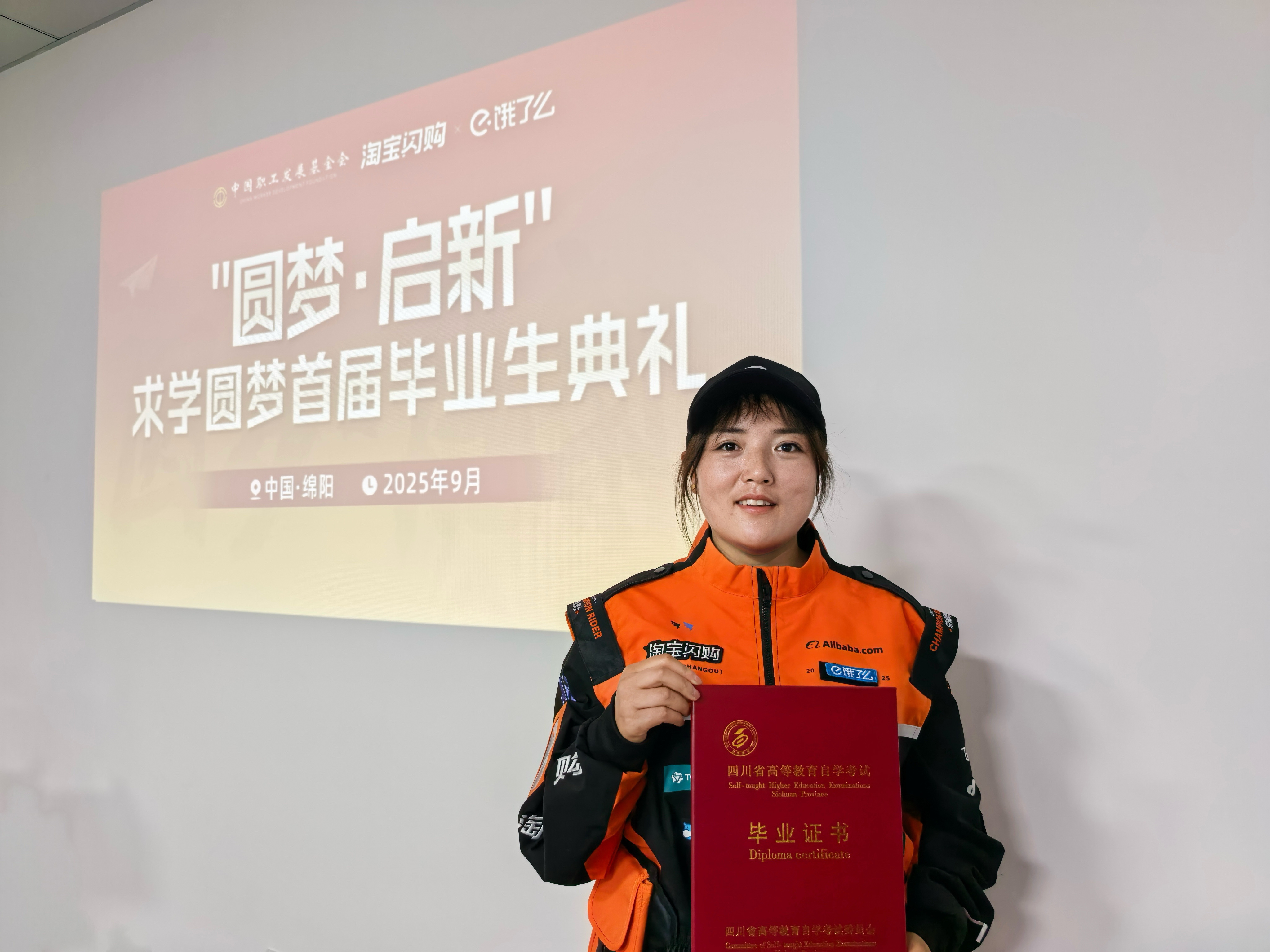 2025年9月18日,淘宝闪购平台的外卖骑手田丹在西南科技大学领取毕业证书。